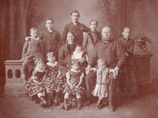 Oben v.l.: Otto, Karl Julius, Robert, Luise, Thomas Carl, Linas; Mitte: Gertrud Sassmann verh. Schmidt mit Rudolf; unten v.l.: Frieda, Clara, Jenny, Albrecht.